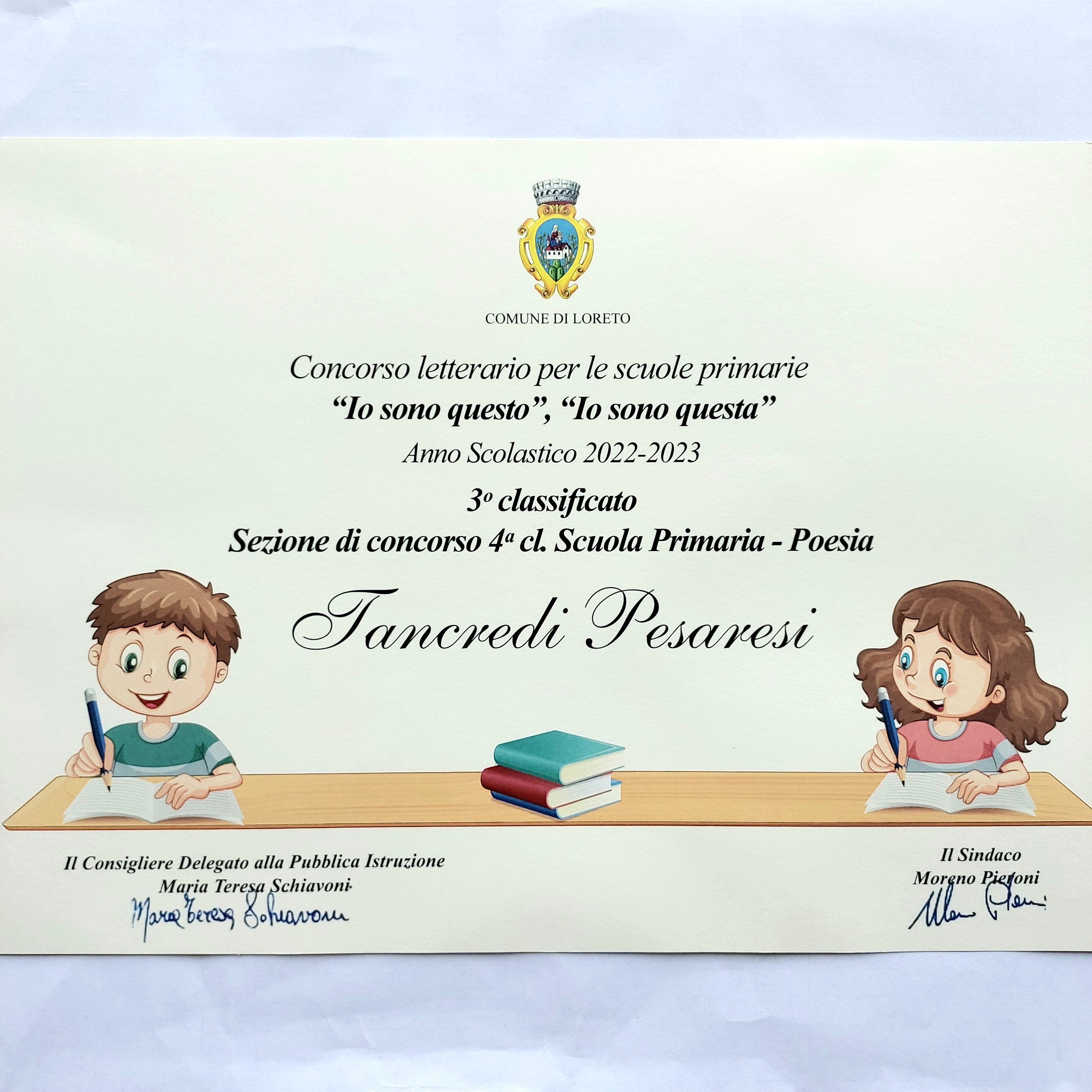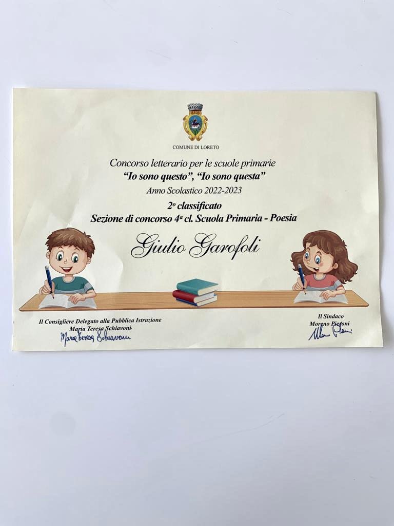 Elementary school students participated in a literary contest sponsored by the municipality of Loreto, in which they were asked to tell about themselves through a poem or essay. Two of our students, Giulio and Tancredi, came second and third place with their poems! Well done guys!